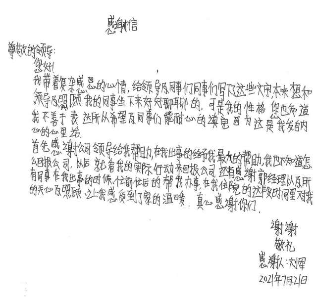 经过半个月治疗休养,刘军手部已无大碍。出院后的他写了一封感谢信并为公司送了一面锦旗,他说道,是风云体育·(中国)官方网站这个大家庭让他感受到了关怀和温暖,他表示要把这种关怀变成工作上的动力,争取早日返回工作岗位,努力工作,回报大家的关心和关爱。